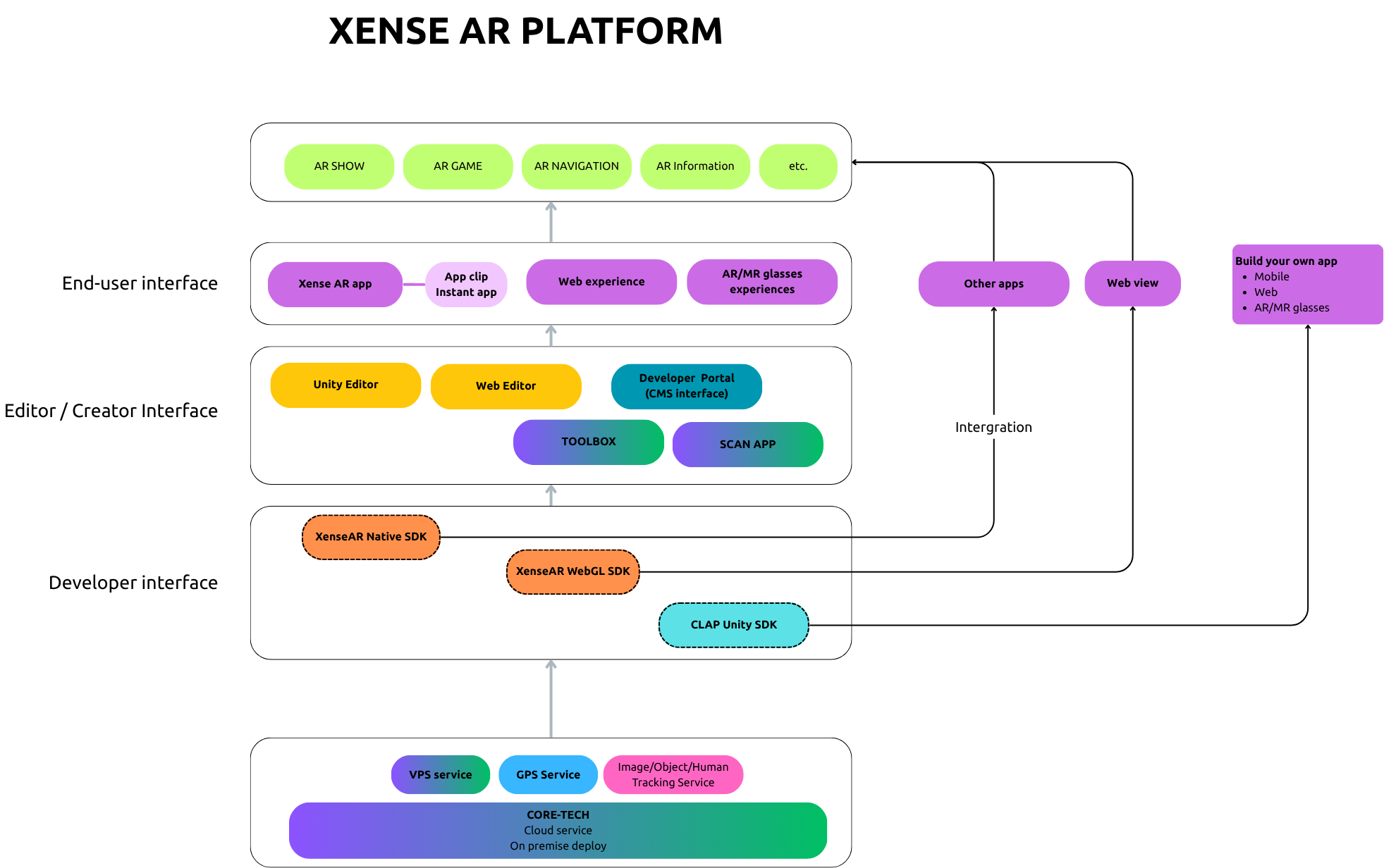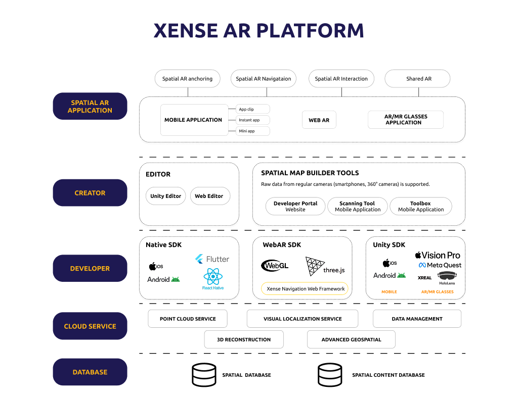 Xense AR cung cấp đầy đủ các lớp giải pháp công nghệ: từ trải nghiệm người dùng cuối, công cụ tạo nội dung (từ web đơn giản đến công cụ chuyên nghiệp), đến SDK tích hợp và tài liệu kỹ thuật dành cho nhà phát triển.