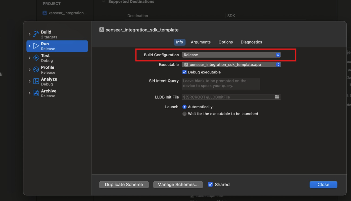 6. Đổi Build Configuration của Scheme thành Release