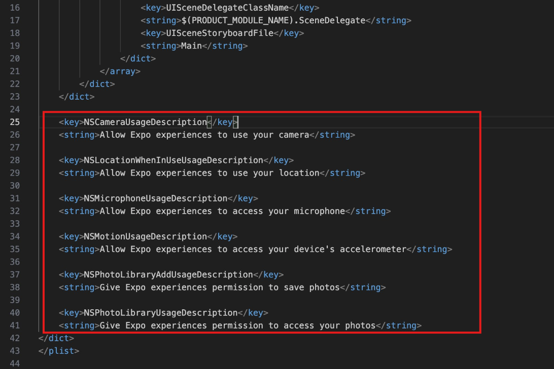 3. Thêm các mô tả sau vào file info.plist, chỉnh sửa mô tả cho phù hợp với ứng dụng được tích hợp.