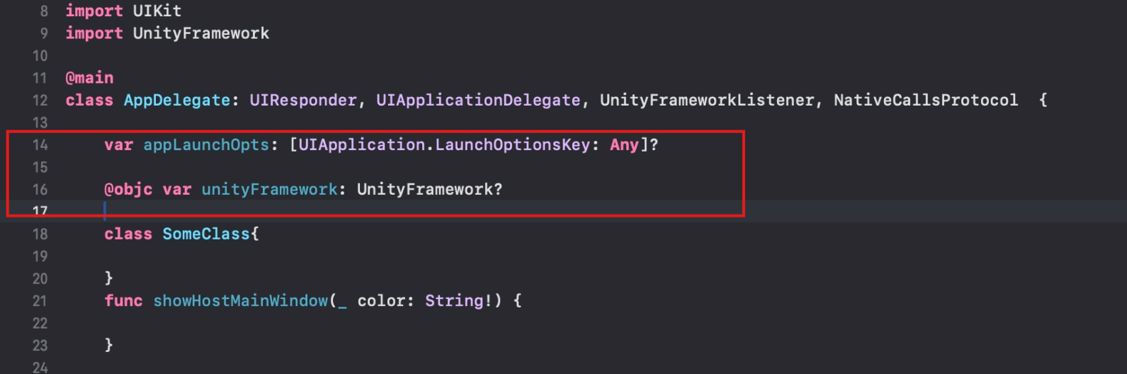 UnityFramework, inheritsUnityFrameworkListenervàNativeCallsProtocol.
